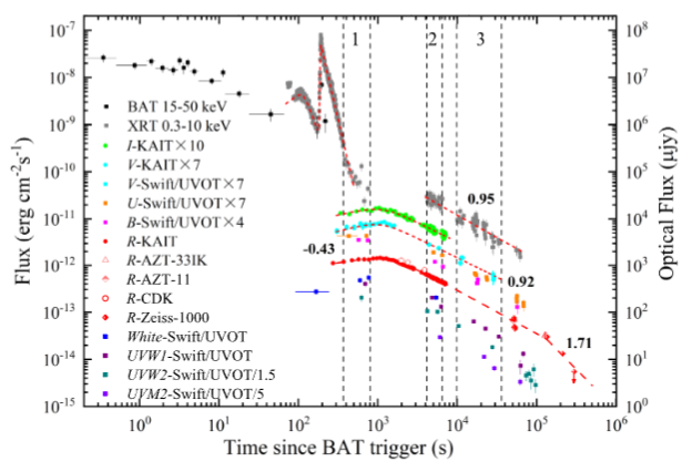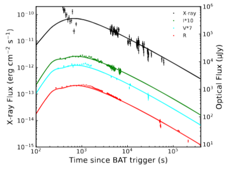 GRB 170519A 是由 Swift 的多脉冲暴,其完整的光学余辉被 KAIT 等地面光学望远镜探测到(如图1所示)。博士生周子民、在导师王祥高教授的指导下,与合作者们对这个结构完整的暴进行了全面的分析。他们的研究发现,在爆发后的X射线耀发中存在热成分,黑体温度大约为 1 keV并随时间衰减,并限制出光球层半径约为2×1011 cm、光球层洛伦兹因子从67.71衰减到46.70、火球初始半径约为 10 7 cm。多波段余辉产生于外激波模型:相对论性喷流与 ISM 介质作用产生正向激波、加速电子产生余辉辐射,通过模型拟合得到:电子谱分布指数 p =1.78、喷流初始动能为 3.21×1053 erg、喷流初始洛伦兹因子为79.58、电子能均分因子为2.74×10-2 。但早期的 KAIT 光学数据,显示光学的 on-set 上升较缓,这意味着微观参数(如磁能均分因子)在早期可能存在演化,通过模型限制,他们得到磁能均分因子在触发后 1000 s之前,以 t -3.19 的幂律快速衰减至 8.23×10 -3。结果如图2所示,与余辉的光变基本吻合。该工作目前已被《The Astrophysical Journal》杂志接收。