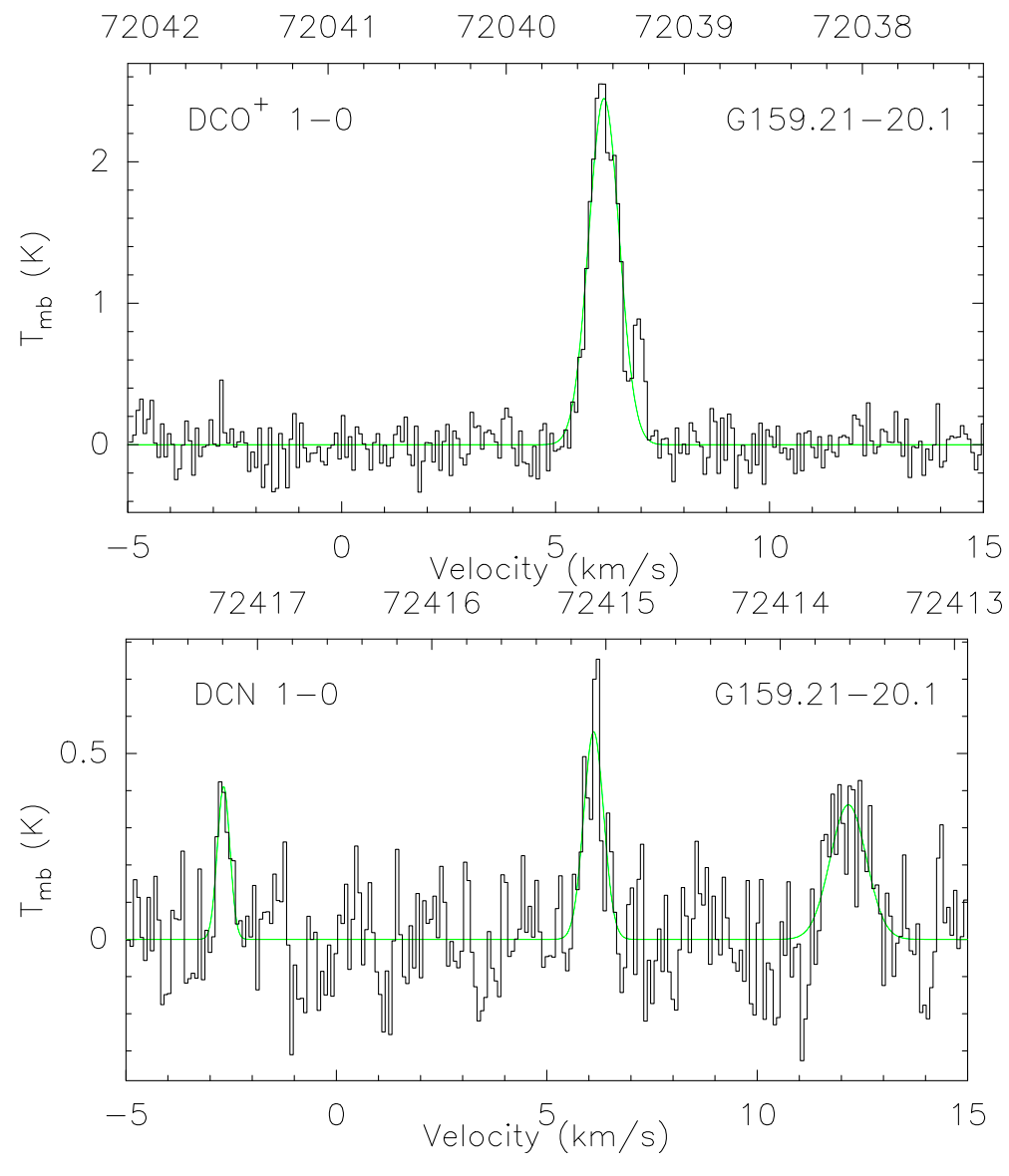 DCO+DCNH13CO+以及H13CN J=1–0的探测率分别为24.5%3.6%22.8%5.2%DCO+发射线的探测率比DCN高出很多,这是由于DCO+的临界密度比DCN的低一个量级。