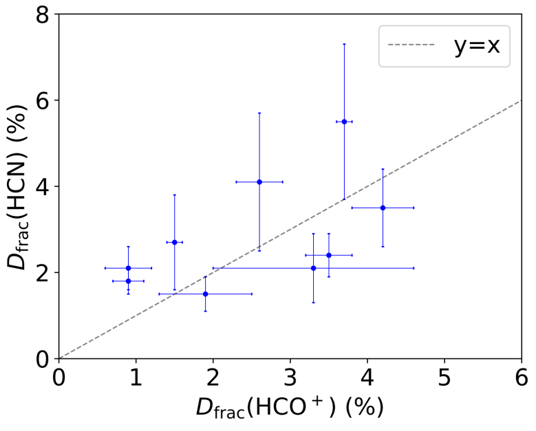 测得113Dfrac(HCO+) 的值范围为0.89% 7.4%,中位数为3.1%11Dfrac(HCN) 范围为 1.5%5.5%,中位数为2.3%如图2所示,9个源同时测得Dfrac (HCO+)Dfrac (HCN)4个源Dfrac (HCO+) 大于Dfrac(HCN),其余5个源则相反。说明二者氘化增丰程度接近。