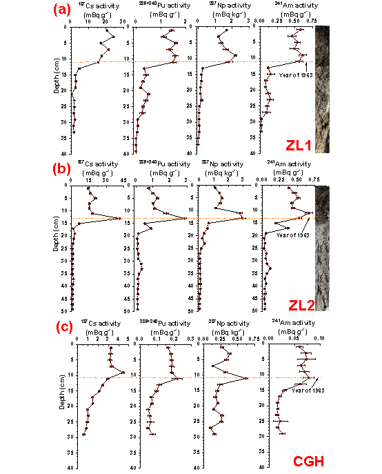 图1. ZL1(a)、ZL2(b)与CGH(c)柱样中¹³⁷Cs、²³⁹⁺²⁴⁰Pu及²³⁷Np比活度的垂直分布特征。