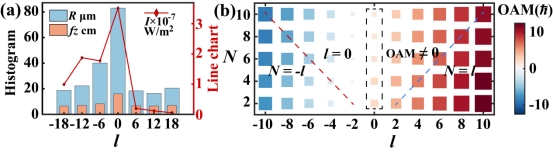图1 (a)不同拓扑电荷下光束半径R、自动聚焦长度fz和峰值强度I的变化;(b)每个光子的总轨道角动量。