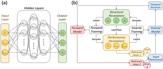 图3 (a)神经网络模型结构;(b)CAB逆向设计流程。